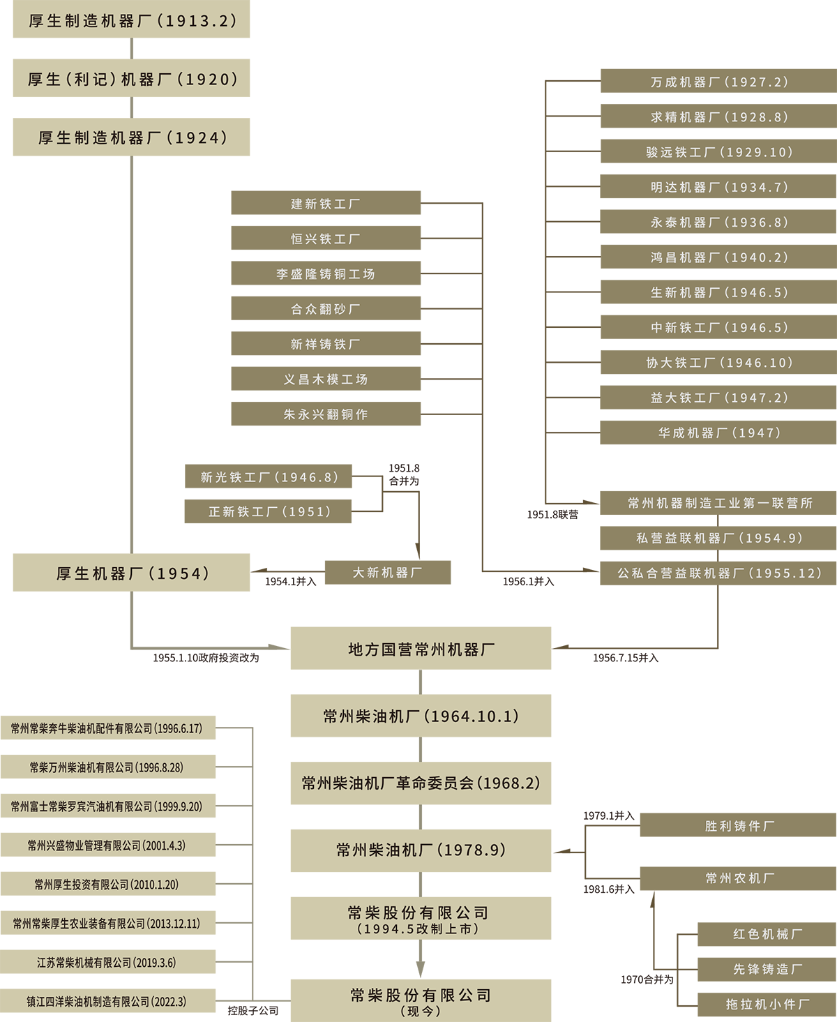 1913年2月,常柴前身企業(yè)厚生制造機器廠由常州民族企業(yè)家奚九如先生憑借愛國的熱情和良知,以實業(yè)救國為宗旨、以振興民族經(jīng)濟為己任而創(chuàng)立,這是常州地區(qū)第一家機械工廠,也是中國最早的內(nèi)燃機專業(yè)制造商之一。當(dāng)年厚生廠仿造成功出8馬力火油發(fā)動機。