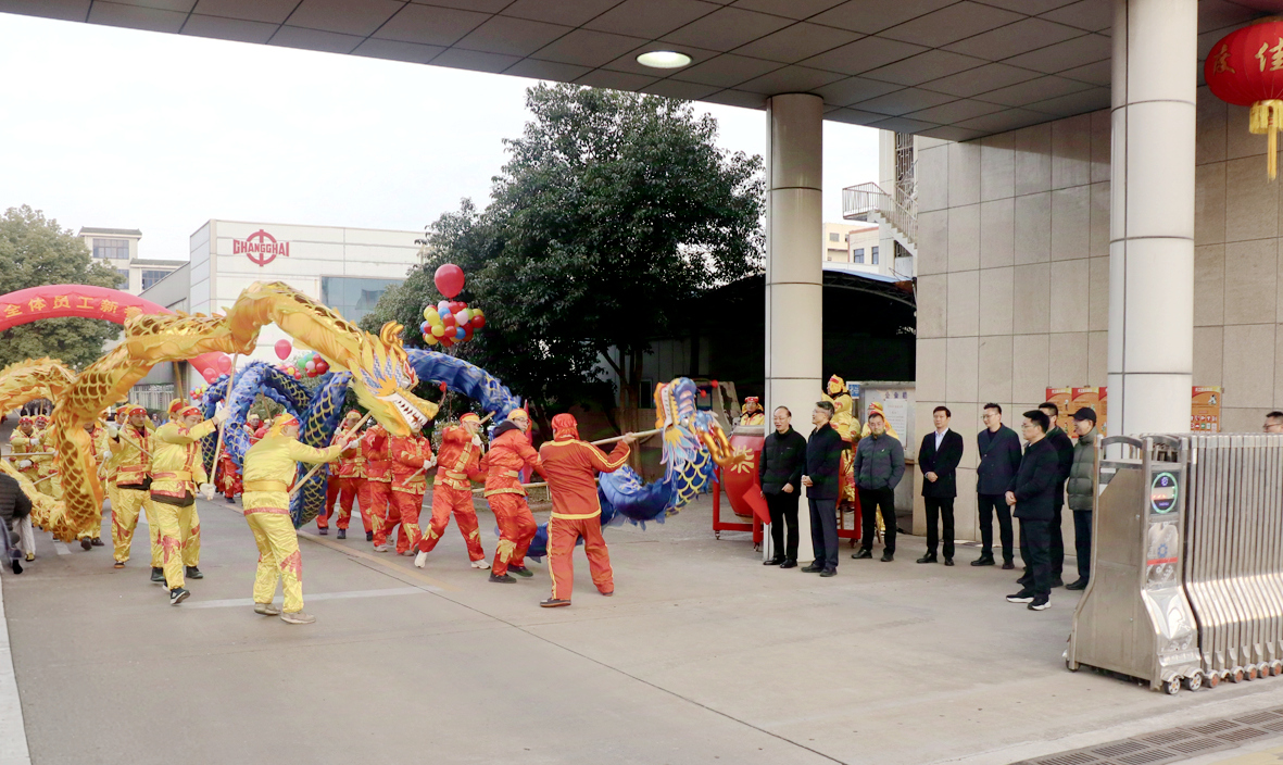 今日常柴訊 2月5日,農(nóng)歷正月初八,是新春佳節(jié)后開(kāi)工的第一天,公司廠區(qū)內(nèi)彩旗飄揚(yáng),洋溢著喜慶祥和的節(jié)日氛圍。早上7點(diǎn)不到,公司副董事長(zhǎng)張新、總經(jīng)理謝國(guó)忠?guī)ьI(lǐng)全體領(lǐng)導(dǎo)班子成員早早地來(lái)到公司大門(mén)口,向蛇年新春第一天上班的員工拜年。在公司總部大門(mén)口,由常柴員工組成的舞龍隊(duì),伴隨著鏗鏘有力的鼓點(diǎn),時(shí)而盤(pán)旋上升,時(shí)而俯沖而下,動(dòng)作流暢而充滿(mǎn)氣勢(shì),預(yù)示著常柴在新的一年里將以嶄新的姿態(tài),迎接挑戰(zhàn),再創(chuàng)輝煌。